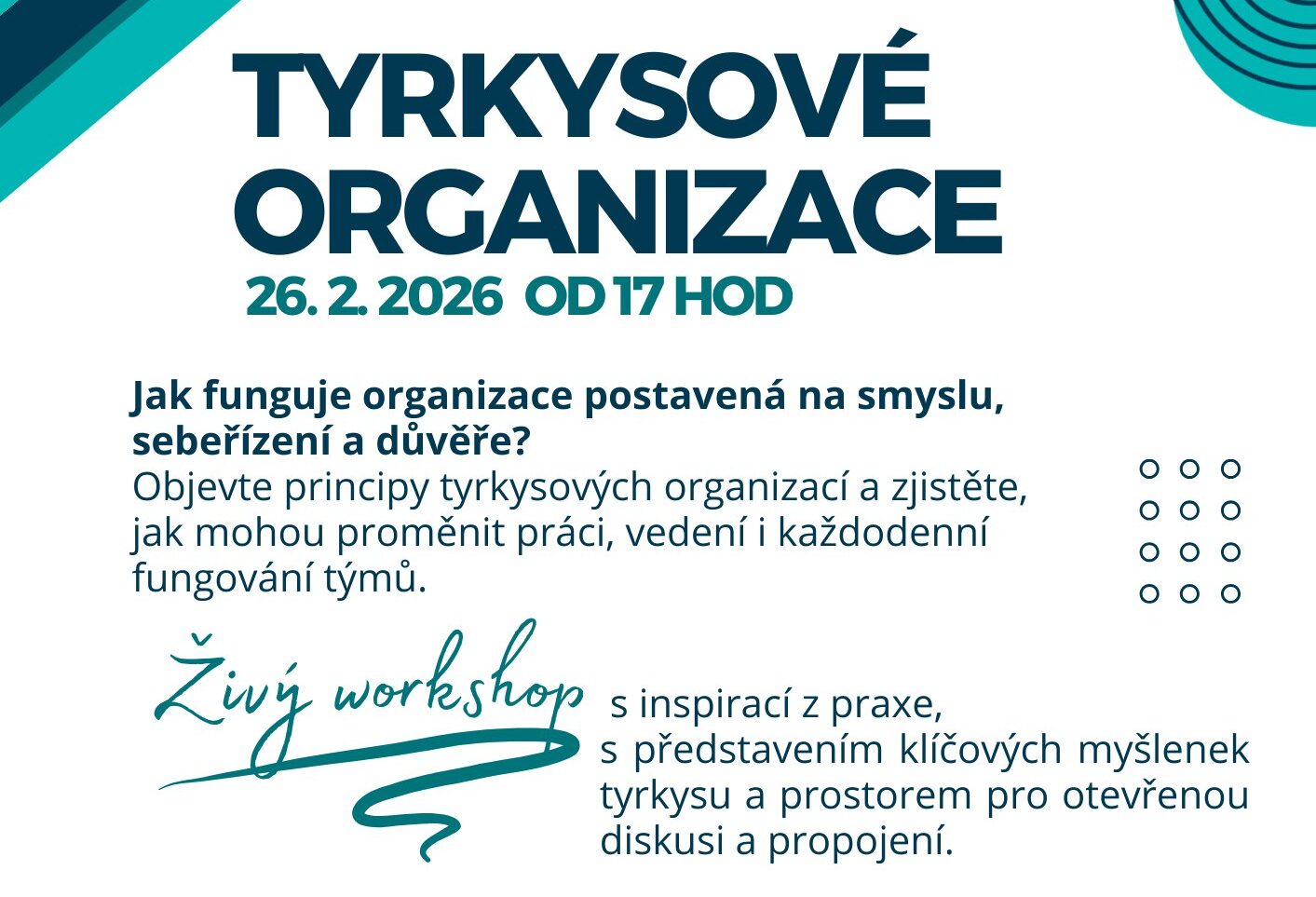 Únor 2026. Zveme vás na živý workshop o Tyrkysových organizacích. BUDE PŘESUNUTO NA KVĚTEN/ČERVEN.