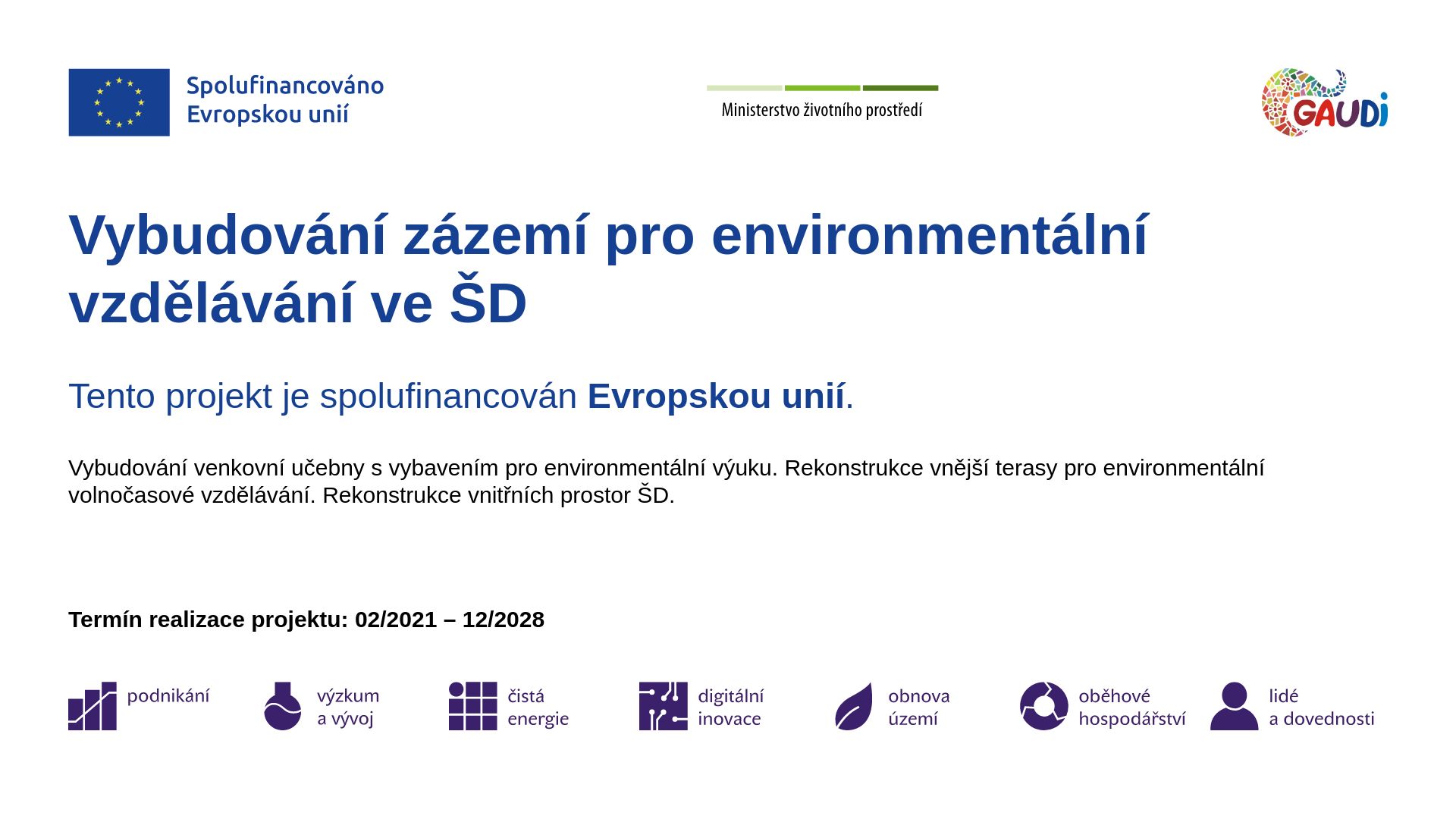 Vybudování venkovní učebny s vybavením pro environmentální výuku. Rekonstrukce vnější terasy pro environmentální volnočasové vzdělávání. Rekonstrukce vnitřních prostor ŠD. Zakoupení vnitřních prostor a pozemku školy pro školní družinu.